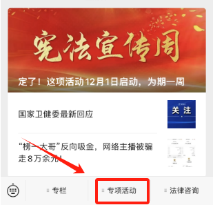 进入黔微普法公众号平台,点击下方中间的菜单栏“专项活动”---“竞答活动”。