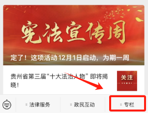 进入贵州司法公众号平台,点击下方中间的菜单栏“专栏”---“竞答活动”。