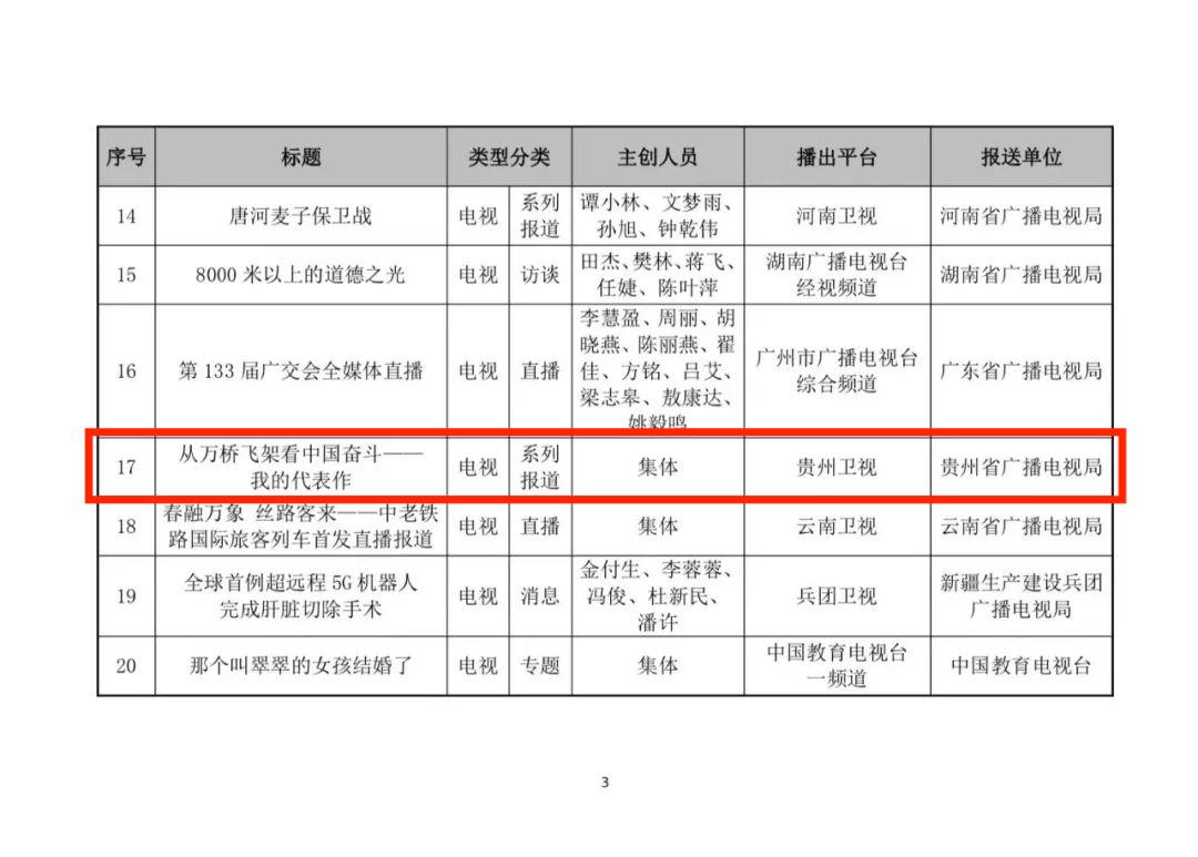 近日,国家广播电视总局发布2023年第二季度优秀广播电视新闻作品入选结果,贵州广播电视台《贵州新闻联播》推出的6集系列报道《从万桥飞架看中国奋斗——我的代表作》入选。