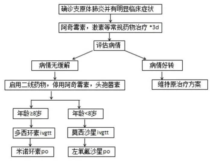 调整后的方案显示,使用常规药物治疗3天后,病情无缓解即按照年龄启用二线药物,其中8岁以上使用多西环素,8岁以下使用莫西沙星,但在使用前,需要向患儿家属做好解释工作,并获得患儿家属的知情同意。