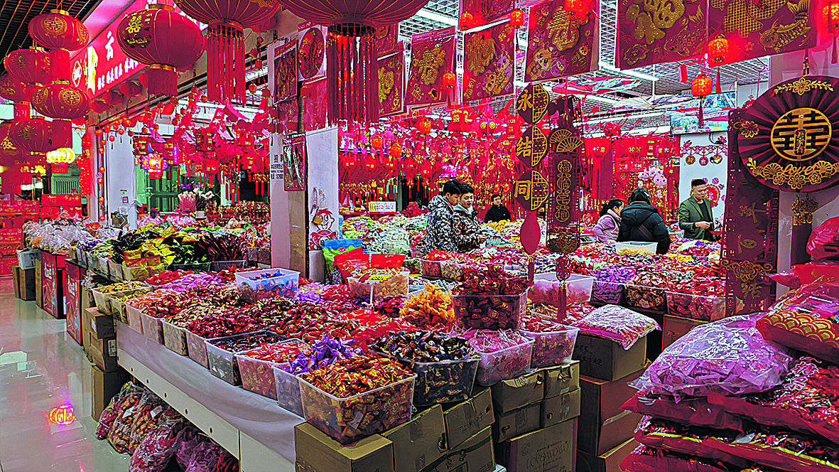 商贸城内,各类年货商品琳琅满目,包括特色食品、家居用品、饰品等。“为了备战春节,我们早早就开始备货,确保供应充足,满足广大消费者的需求。相较于去年,今年我们的零食价格降低了约30%,每斤便宜了五六块钱。”经营食品零售的冯老板一边收银一边介绍。