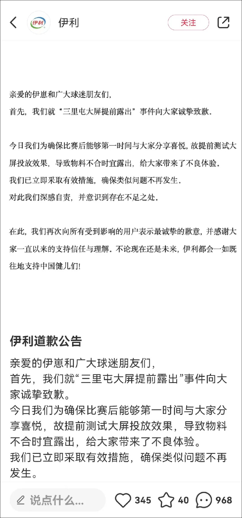 当天,伊利在社交平台上发布道歉公告称,当天为确保比赛后能够第一时间与大家分享喜悦,故提前测试大屏投放效果,导致物料不合时宜露出,给大家带来了不良体验。已立即采取有效措施,确保类似问题不再发生。