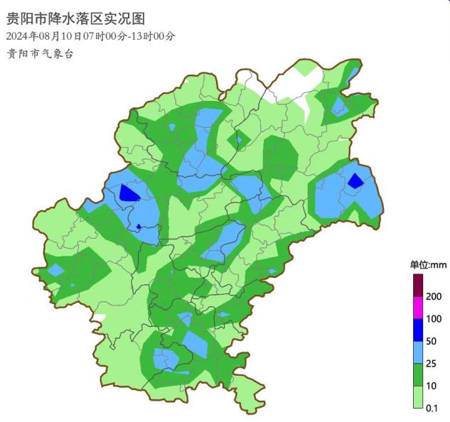 据监测,截至13时,贵阳贵安共出现6站暴雨(开阳县2站:鲁底61.5、龙岗56.8;修文县3站:洒坪59.3、红星54.1、六屯桃源52.8;花溪区1站:燕楼同心51.7);45站大雨、67站中雨。最大降水量为开阳鲁底61.5毫米;最大小时雨强为修文久长44.6毫米每小时。