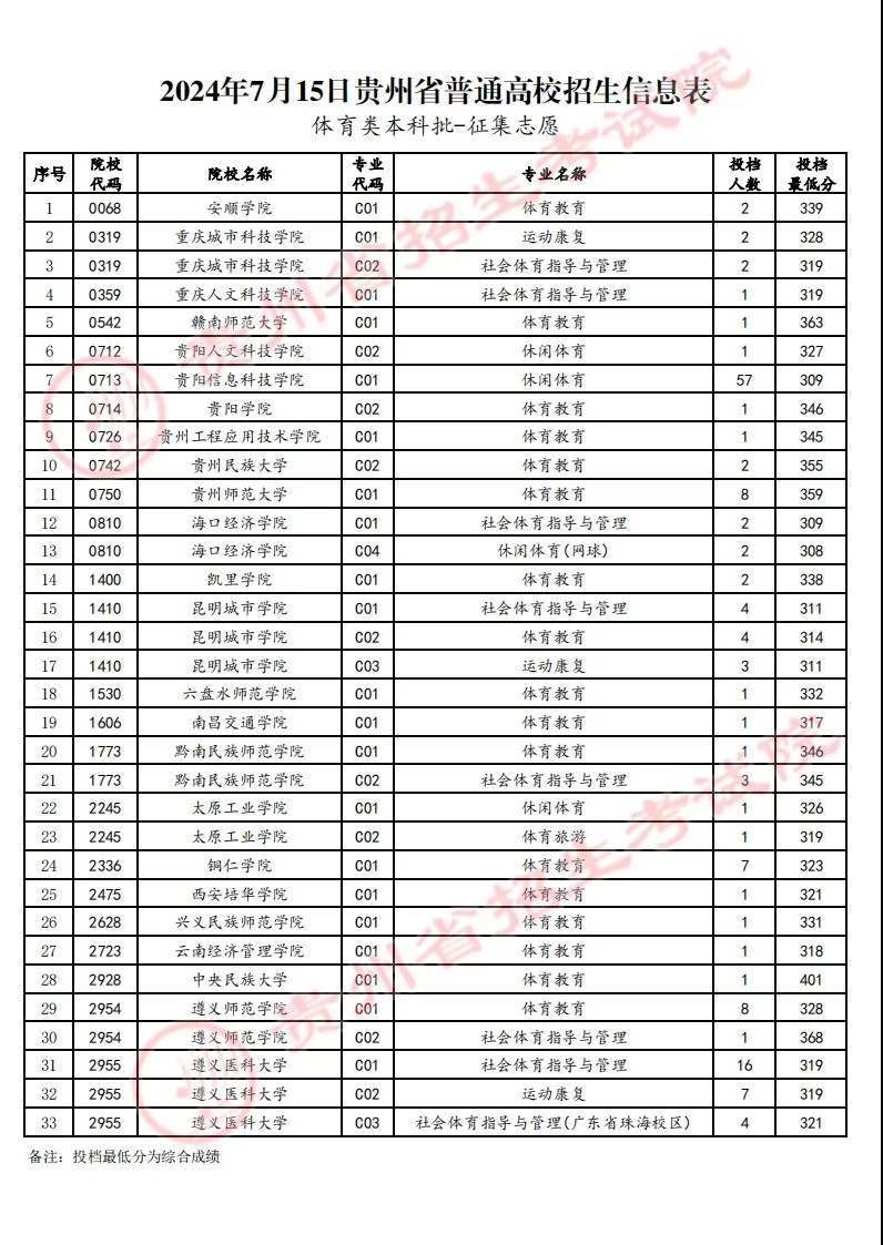 贵州2024年普通高校招生艺术类、体育类高职(专科)批第2次征集志愿通告