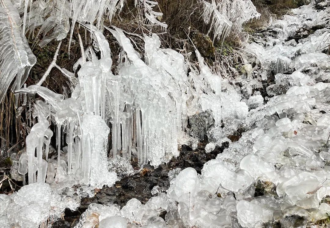 放眼望去,草木皆“冰”。冰花以一种晶莹剔透的形式,开在草地上、树枝上、峭壁上。不同的冰花,开出不同的形状,玉树琼花、冰杖雪剑……它们在寒冷的气温下悄然绽放。