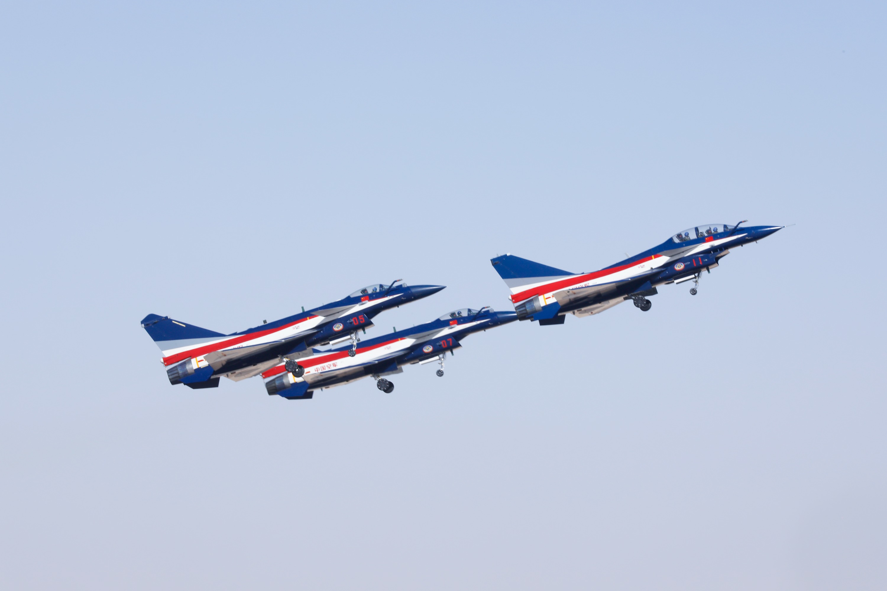 当地时间13时30分许,3架歼-10表演机打开滑行灯,以箭队加力起飞,紧接着第二批三机加力跟进起飞,在空中完成集结编组。