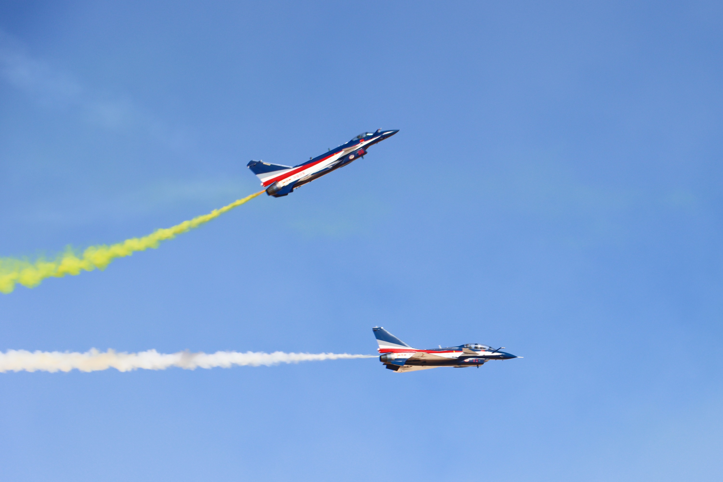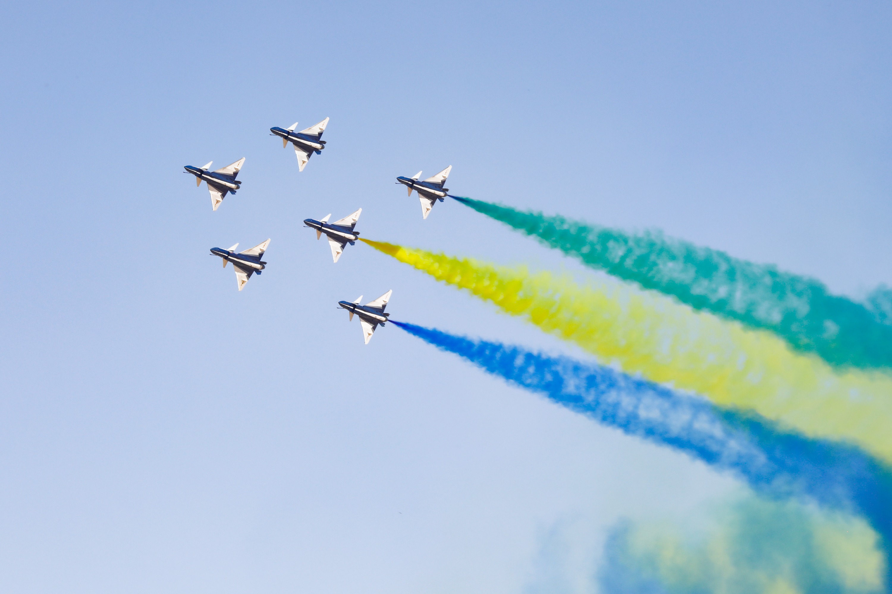 一架架表演机时而盘旋、时而俯冲,队形转换灵活自如。六机分组开花、四机垂直开花等数十个高难度动作轮番上演,动作衔接紧凑、队形整齐壮观,力量与速度的极限碰撞,技术与艺术的完美协调,展现出飞行员对飞机边界性能的超强掌控能力以及战机优异机动性能。