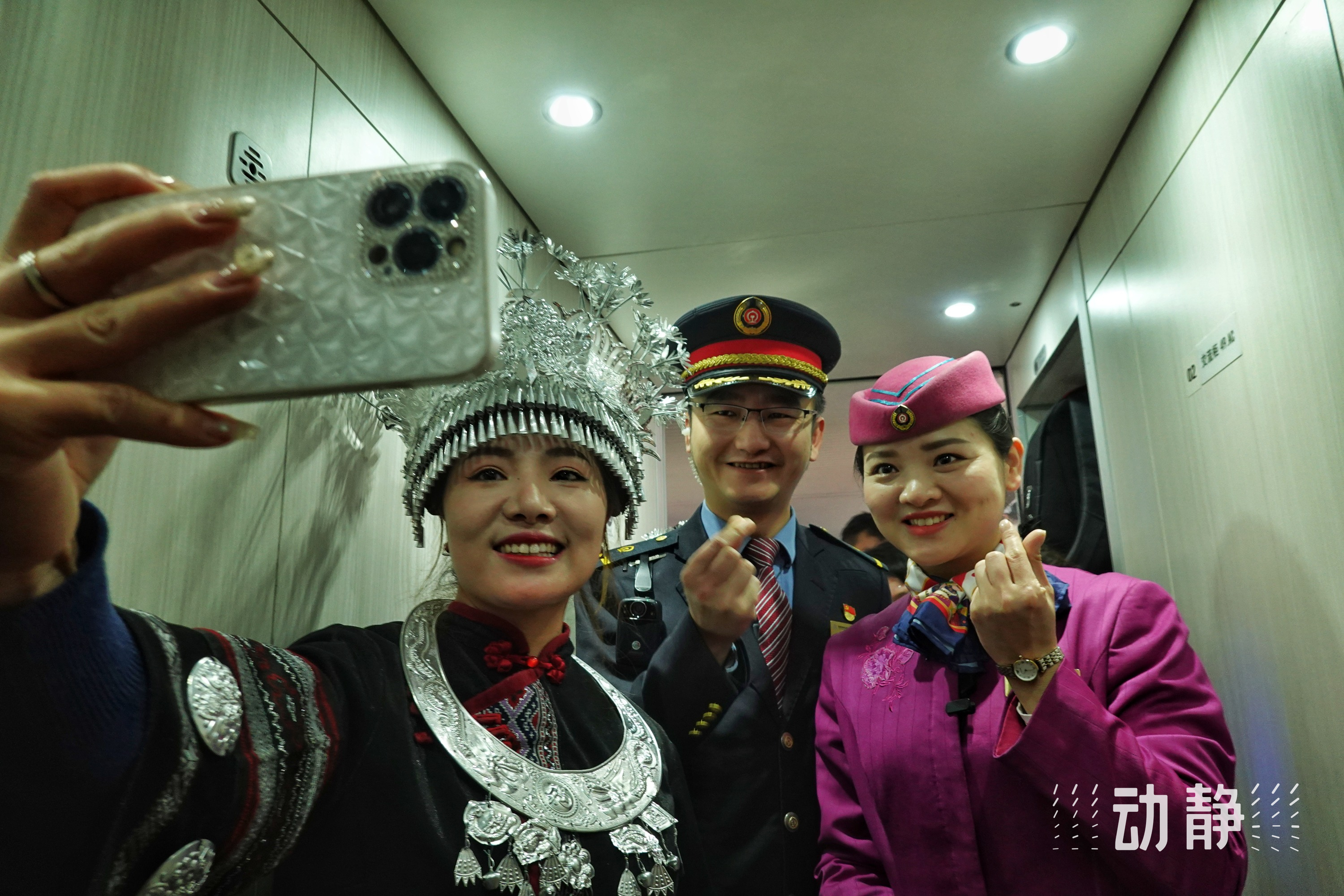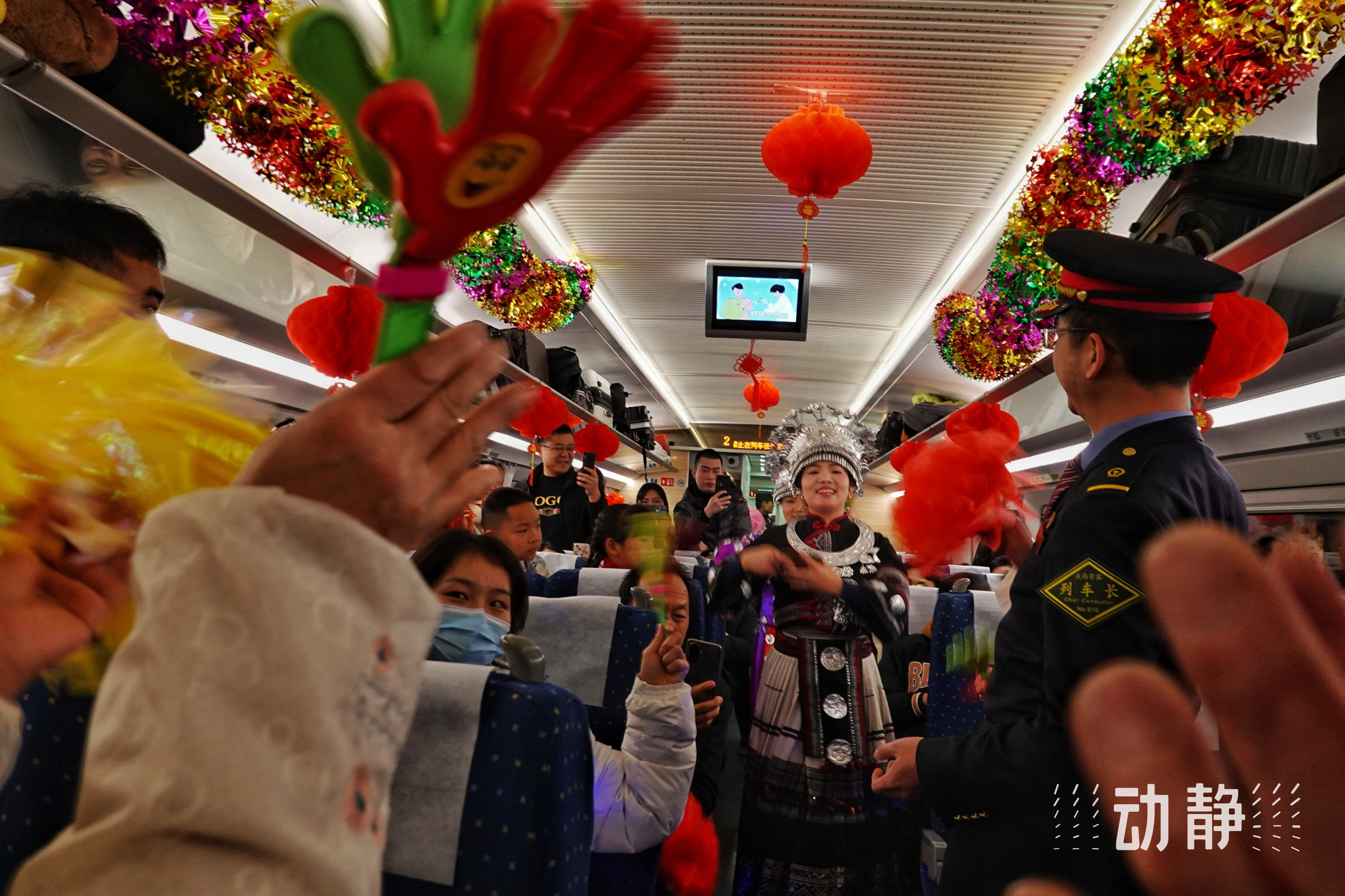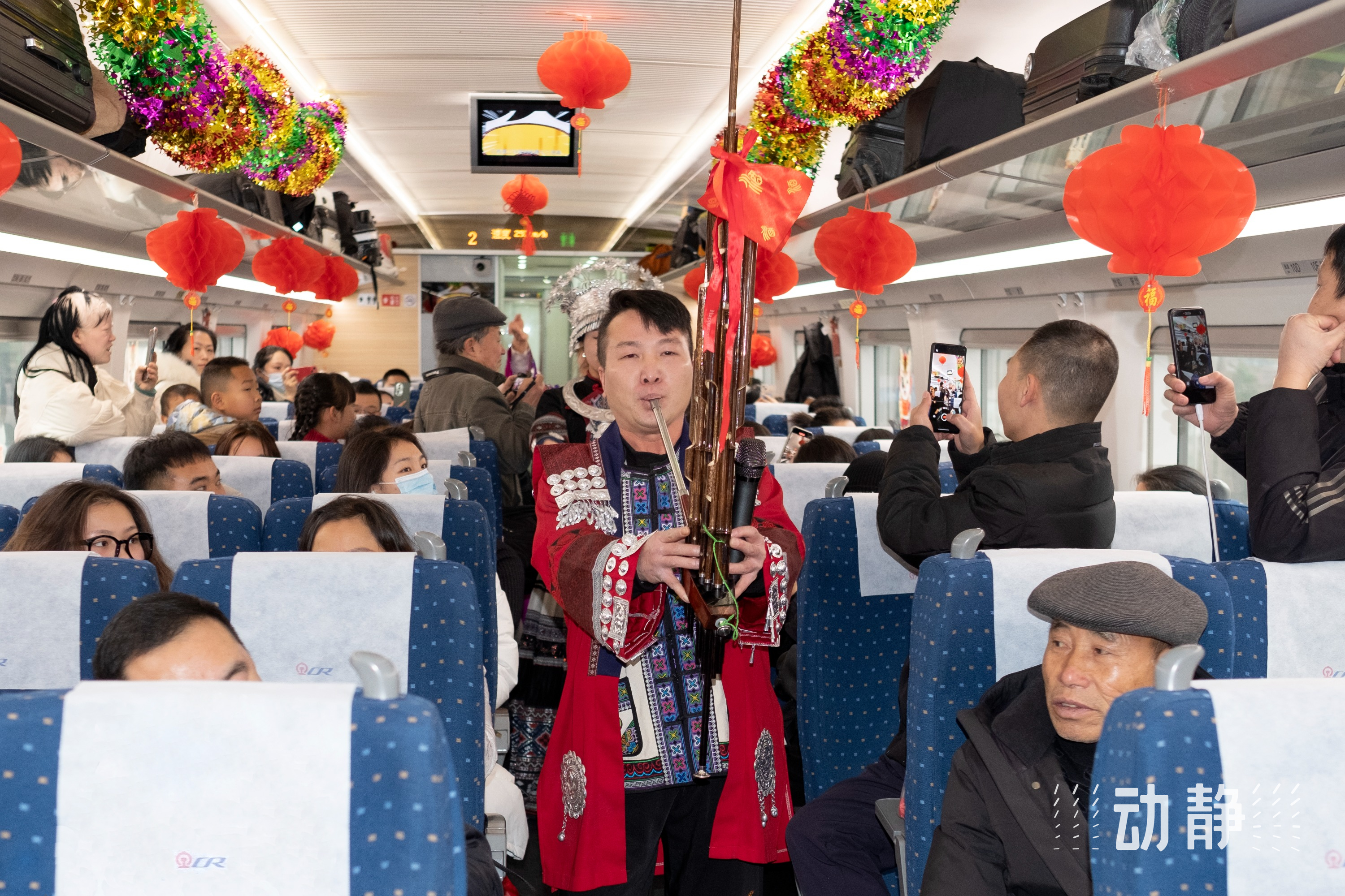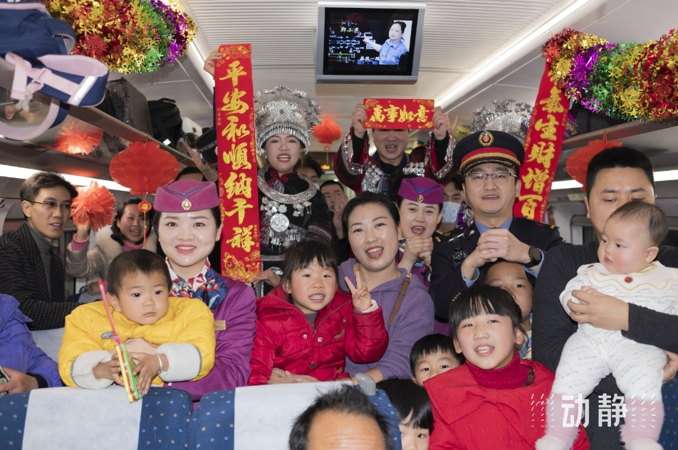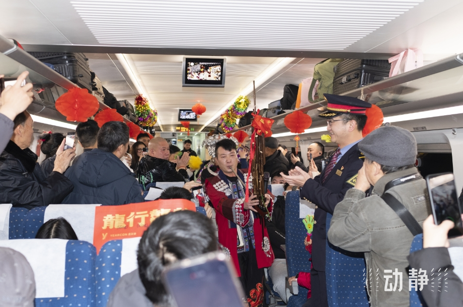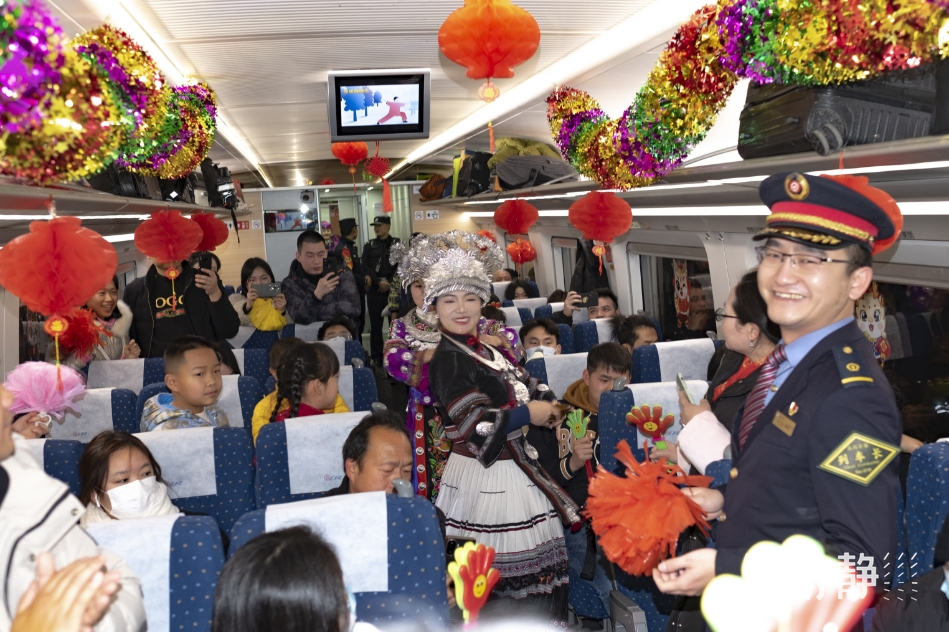 “旅客朋友们,新春伊始,我们相聚就是缘分,祝愿大家在新的一年里心想事成、平安顺遂!”随着列车长郝元箐高亢激昂的声音,一支欢快的芦笙曲演奏起来,不少旅客跟着节拍鼓起掌声,有的外地游客索性跟着跳起来,还有的掏出手机录视频拍照片。