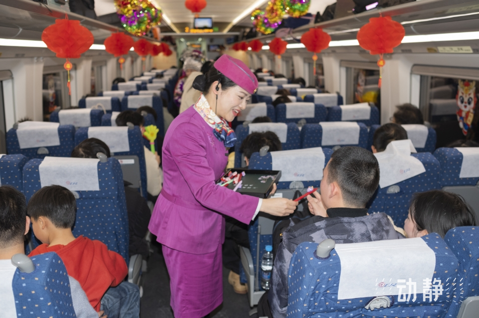新春伊始,岁月如新。2月10日,正月初一,由贵阳北开往宁海的G2334次动车组列车上,乘车旅客与列车工作人员一起,吃汤圆、抽盲盒、吹芦笙、对山歌、跳民族舞、写心愿卡等送祝福活动,在愉悦祥和的旅途中共度龙年新春。