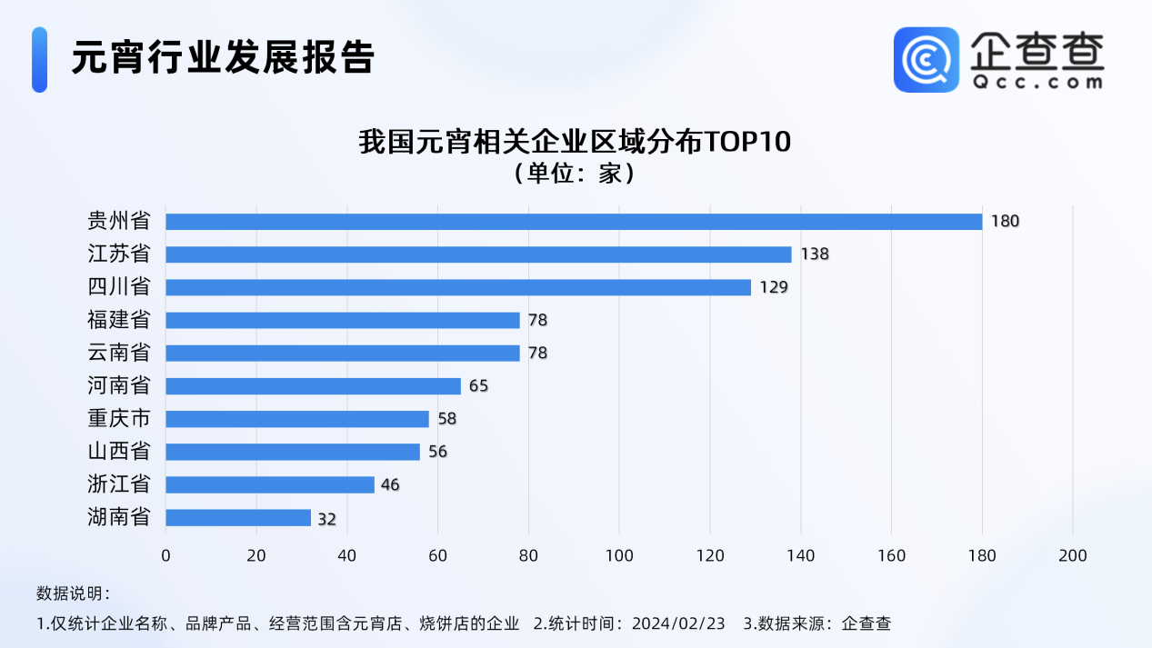 2月23日,记者从企查查app获悉,近十年来,我国元宵相关企业注册量呈整体增长态势,截至目前现存元宵相关企业1077家。贵州现存180家元宵相关企业,位居全国第一。