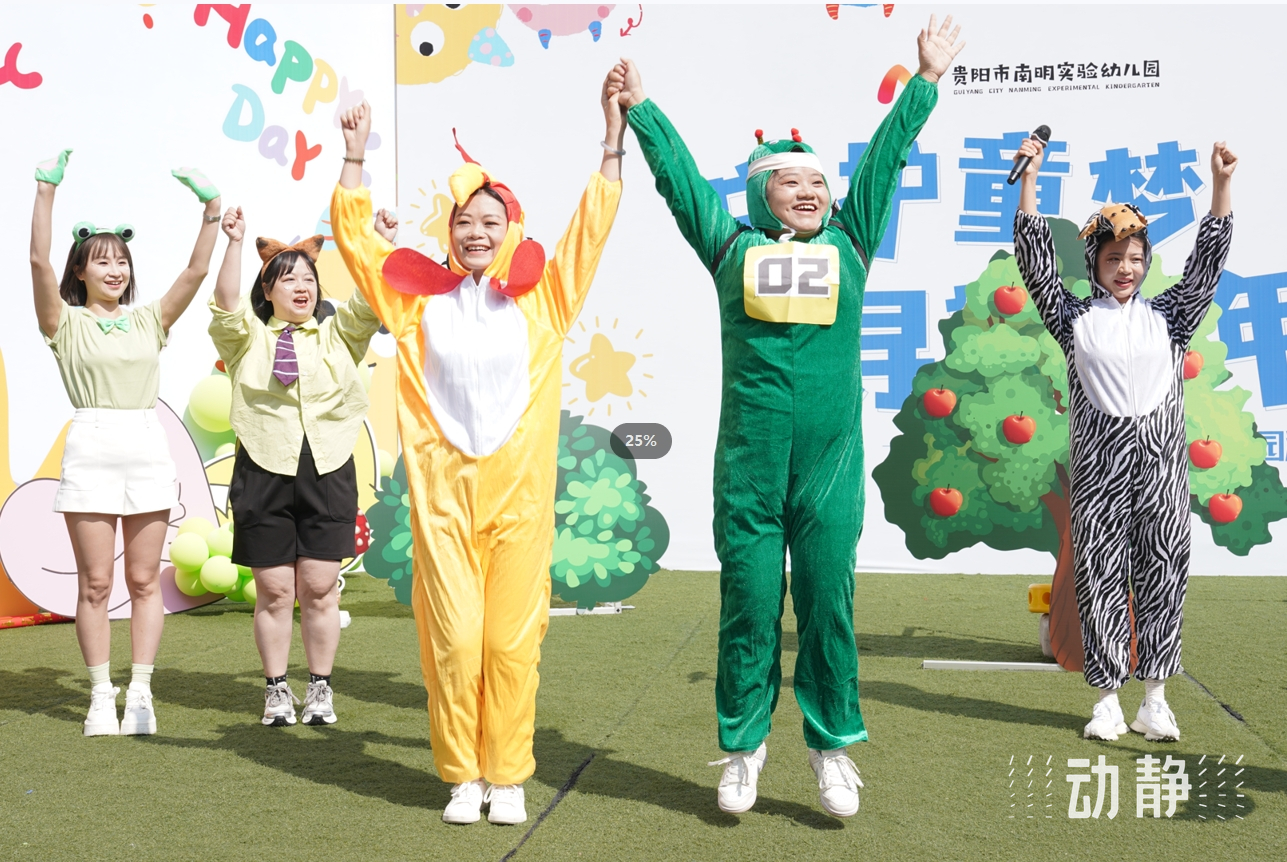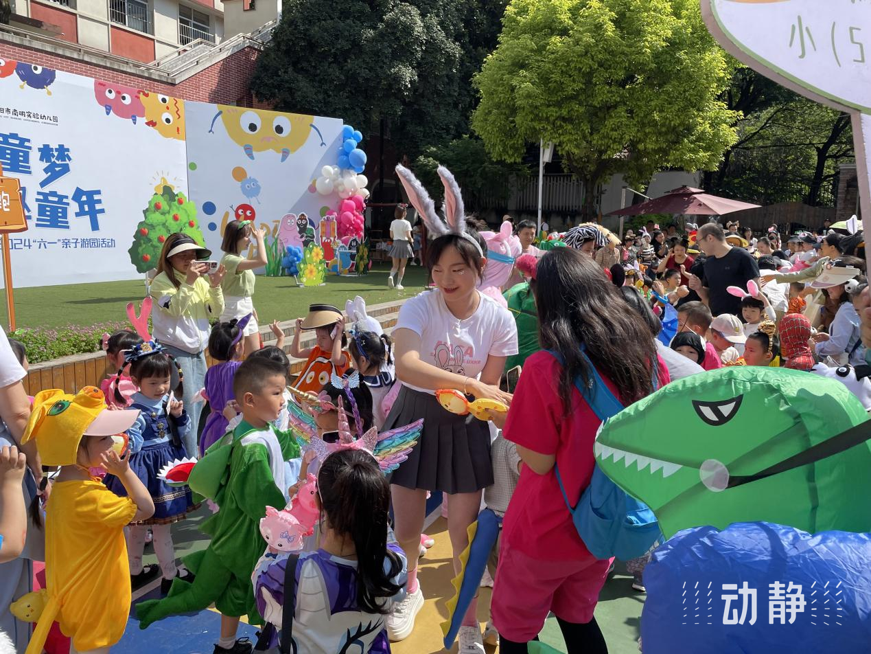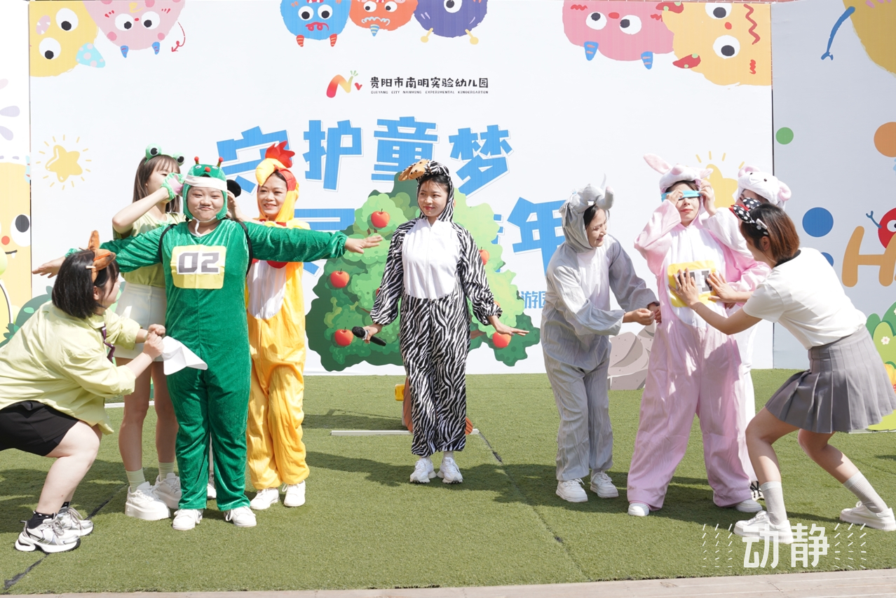 今天(5月31日),贵阳市南明实验幼儿园洋溢着欢快的节日氛围,幼儿园小班的小朋友与家长们身着各式各样动物服装入园参加主题为“守护童梦·寻趣童年”的“六一”亲子游园活动,幼儿园变身为充满奇幻色彩的森林王国。
