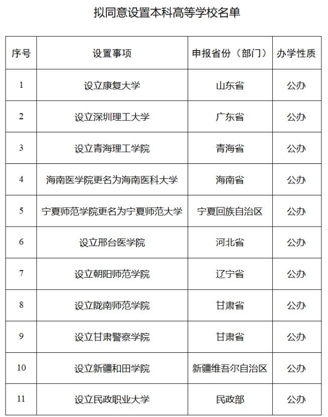 今天,教育部发展规划司发布关于拟同意设置本科高等学校的公示。根据《中华人民共和国高等教育法》《普通高等学校设置暂行条例》《普通本科学校设置暂行规定》《本科层次职业学校设置标准(试行)》等有关规定以及第八届全国高等学校设置评议委员会考察评议结果,经教育部党组会议审议,拟同意设置康复大学等24所学校。