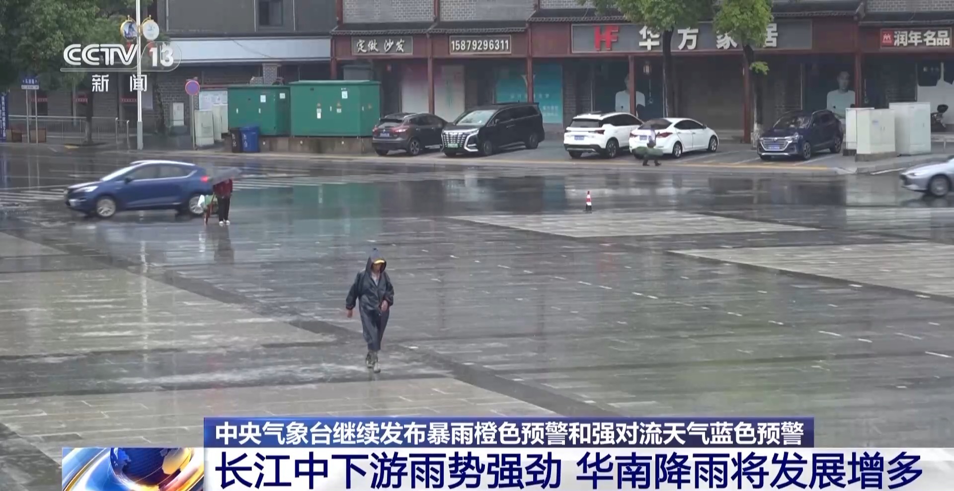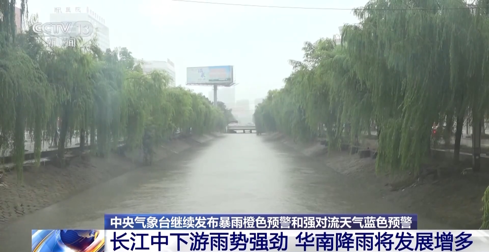 中央气象台预计,未来三天,长江中下游雨势依旧强劲,局地伴有强对流天气。明后两天华南地区的降雨也将发展增多。中央气象台今天(23日)继续发布暴雨橙色预警和强对流天气蓝色预警。中国气象局将暴雨三级应急响应提升为二级。
