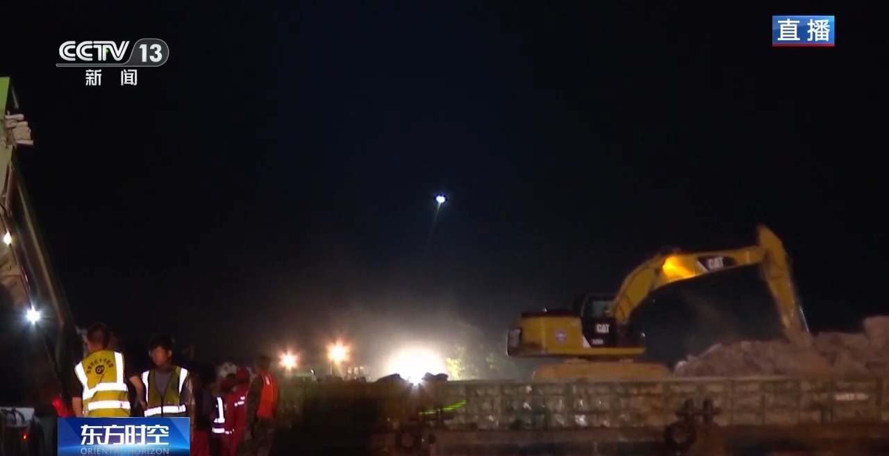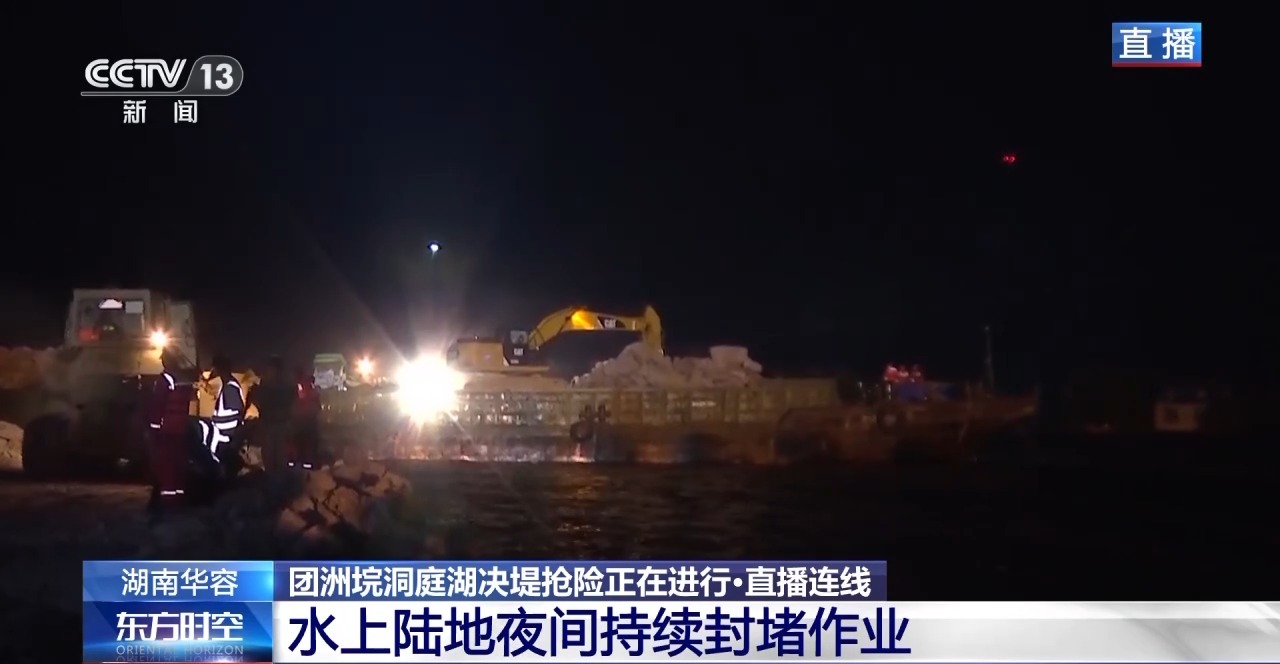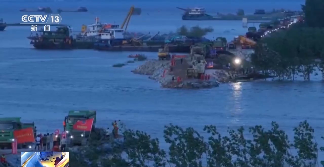 总台央视记者 张腾飞:虽然夜色已晚,但整个现场一片忙碌,架设临时的封堵体不断往前推进,通过陆上的方式向里边抛投石块。同时有一条大船正横亘在镜头中间,它通过携带的大型机械,把重型石块直接向决口进行抛投。有了船舶的加入、巨量的石料补充,现场封堵作业不断加快进度。