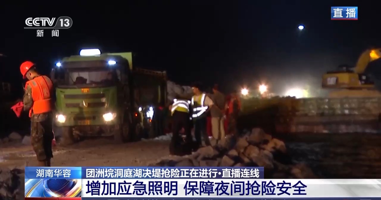 怎么保证安全?现场架起了多种应急照明,并增加了安全员,来保证夜间施工的安全。右岸、左岸入夜后都是灯火通明,不仅是陆地上的照明,天空中也有一个细流式的无人机照明。整个洞庭湖抢险大堤的工段全部都被打亮了,通过增加照明来减少夜间可能发生的风险。