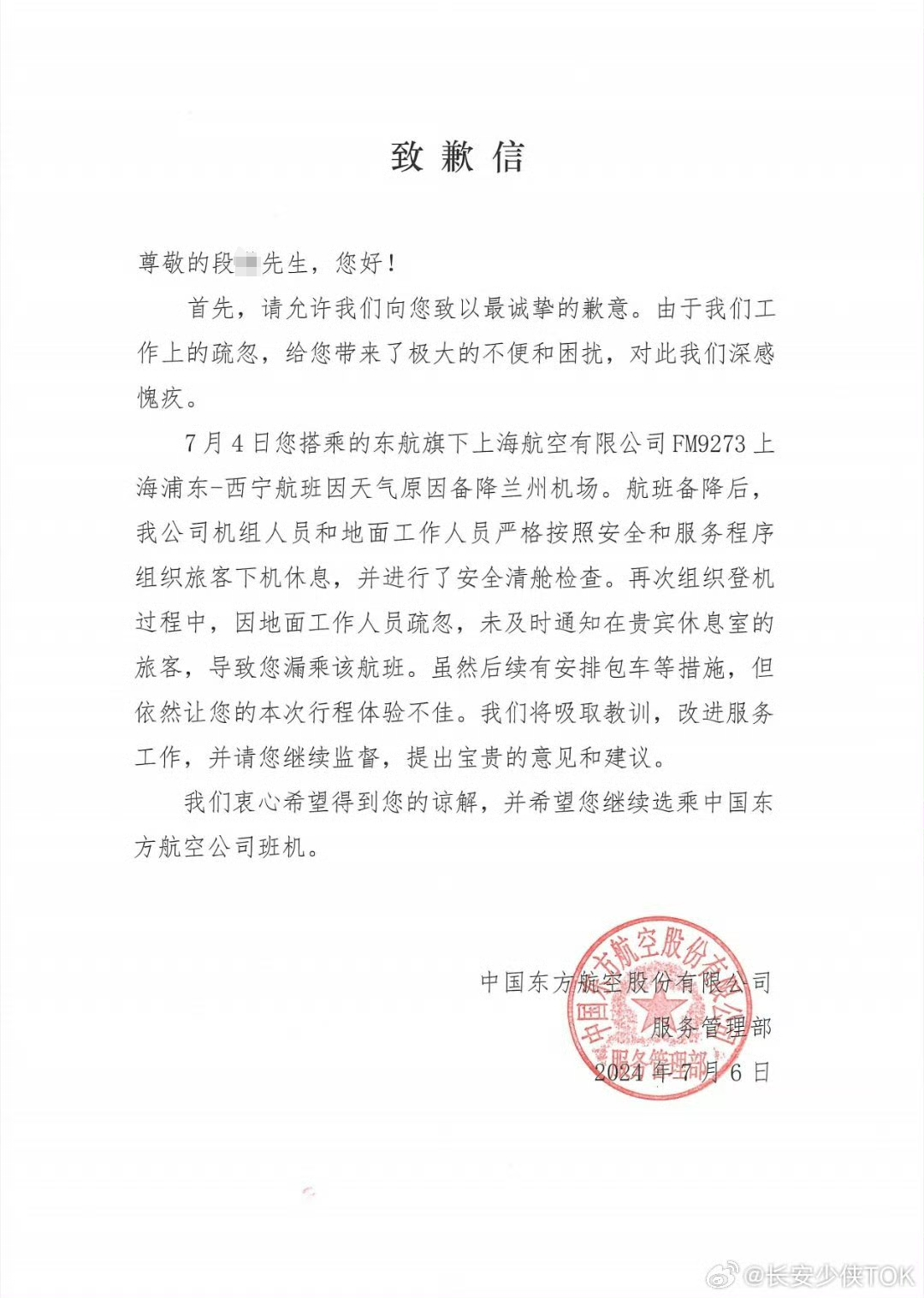 据橙柿互动报道,7月7日,当事人@长安少侠TOK 发文称,收到来自“中国东方航空公司服务管理部“的书面道歉函,整件事情算是有了一个初步的解决。