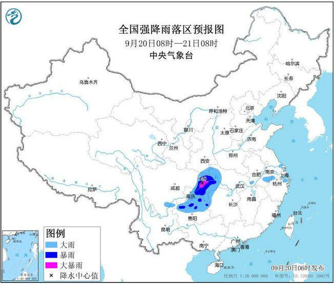预计,9月20日08时至21日08时,安徽南部、江苏南部、浙江北部、陕西南部、湖北西部、四川盆地东部和南部、重庆中东部、贵州北部、湖南西北部等地部分地区有大到暴雨,其中,重庆东北部等地部分地区有大暴雨(100~140毫米)。上述部分地区伴有短时强降水(最大小时降雨量20~50毫米,局地可超过60毫米),局地有雷暴大风等强对流天气。