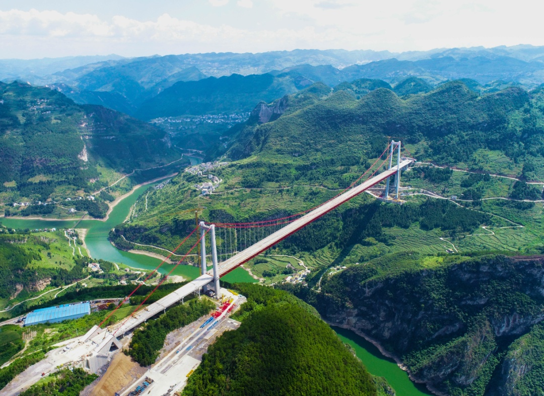 朱能建介绍,作为一个山区典型喀斯特地貌环境下近千米级悬索桥,桐梓河大桥横跨地质灾害区和既有道路,施工范围内地形差异较大,最大高差达105米,具有施工区域地势险峻、技术难度大、安全风险高等特点,是一座科技攻关型桥梁。其中桐梓岸引桥共有T梁72片,自开始架设T梁以来,项目部精心组织、科学筹划,重点保障T梁运输、安装关键环节施工质量、安全,有效克服运距远、空间狭窄、恶劣天气等不利因素影响,最终顺利完成全桥贯通。