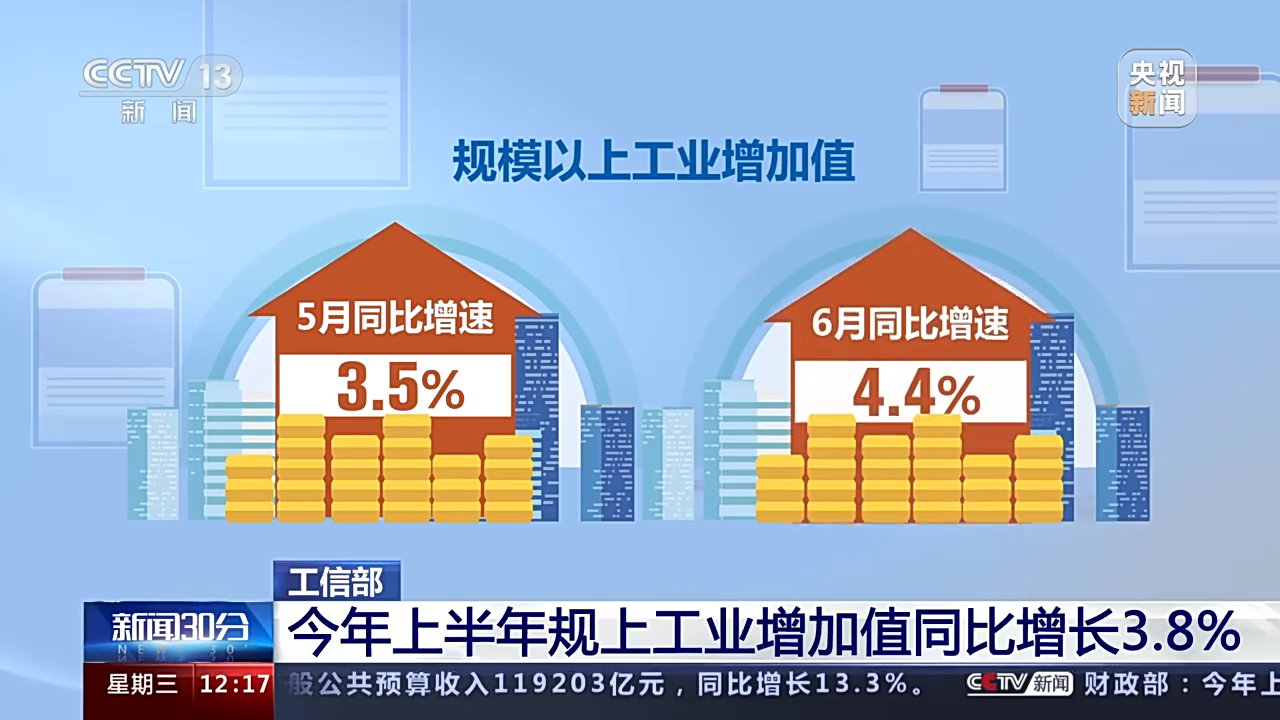 其中,5、6月当月同比增速分别为3.5%、4.4%,呈现逐月回升态势。制造业增加值占GDP比重达27.8%,较上年底提高0.1个百分点。工业投资保持扩张,上半年同比增长8.9%,增速较一季度加快0.3个百分点。工业出口提质升级,上半年“新三样”出口同比增长61.6%。企业效益边际改善,利润降幅连续3个月收窄,利润结构不断优化,5月份装备制造业利润同比增长15.2%,连续两个月保持两位数增长。“小巨人”、专精特新企业营业收入、利润增长均高于规上工业企业。