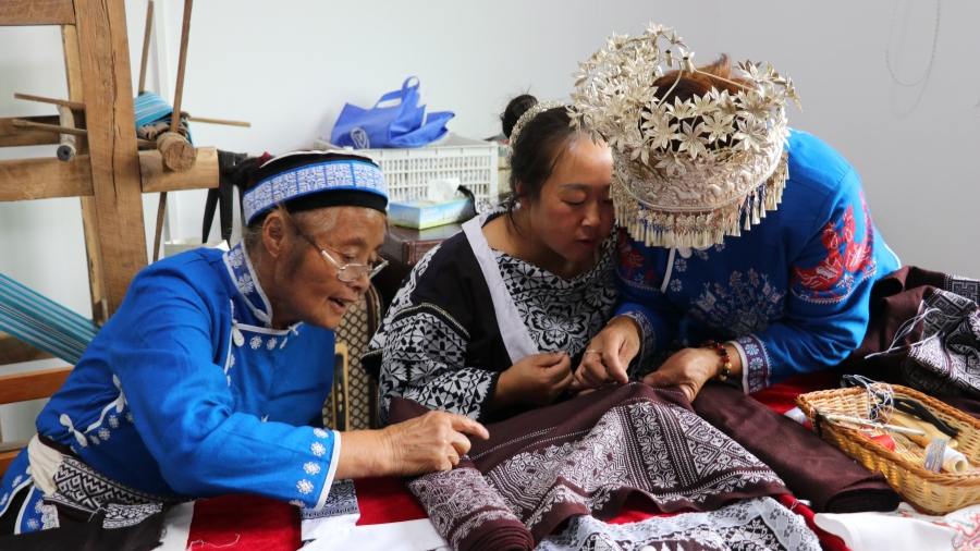 通过“村集体经济组织+村干部+村民”发展模式,新明村村干部带头带动辖区群众通过资金、技术等入股,同时加大对绣娘的培养,目前已培养成熟绣娘50余名,其中有5名绣娘专职参与加工坊工作,40余名绣娘参与加工坊零星就业。