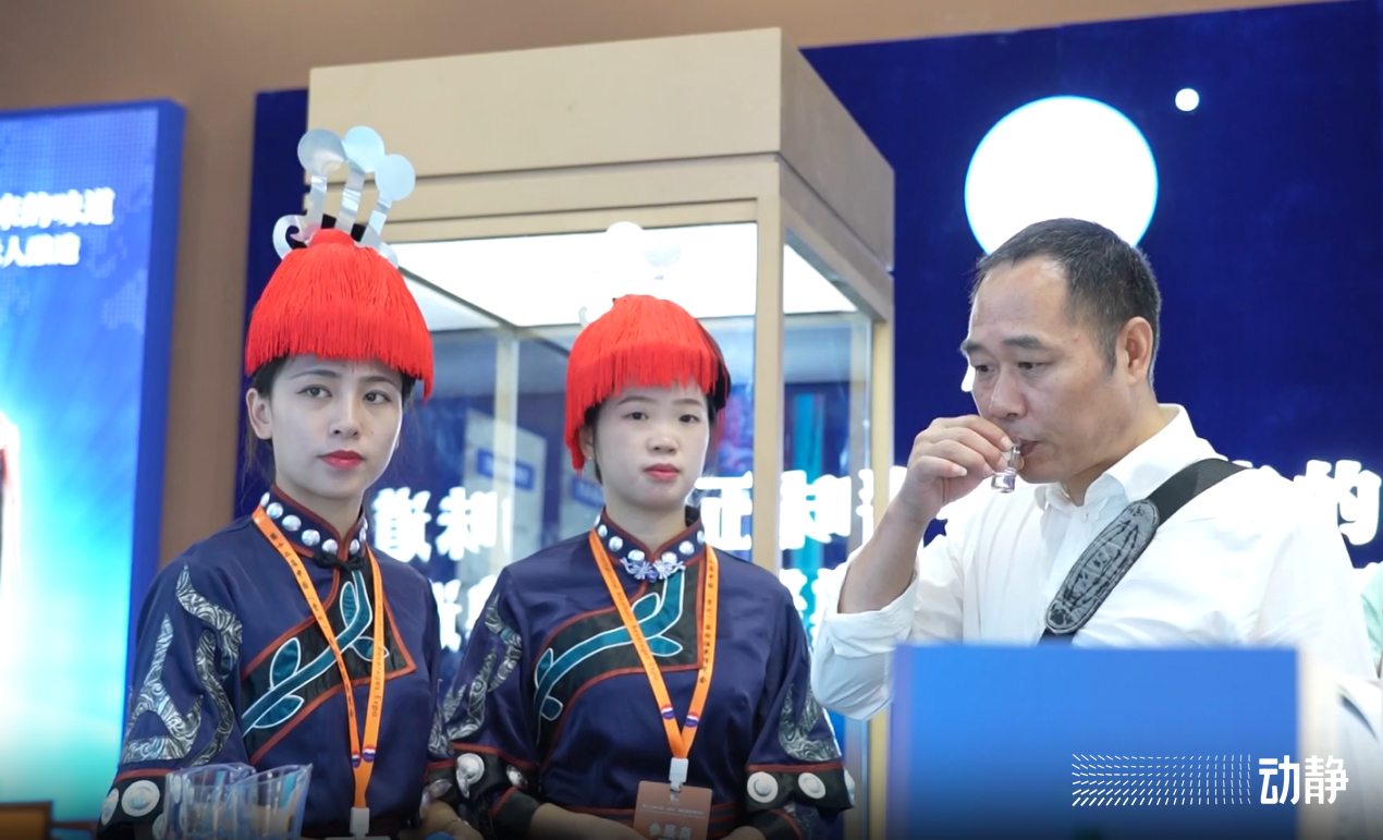 中国名酒馆内人头攒动,以蓝色为主调,搭配仡佬族图腾元素的雄正集团展区让人眼前一亮。步入展区,仡佬族待客之道:“三幺台”带来满满的仪式感,吸引着往来的客商驻足洽谈。