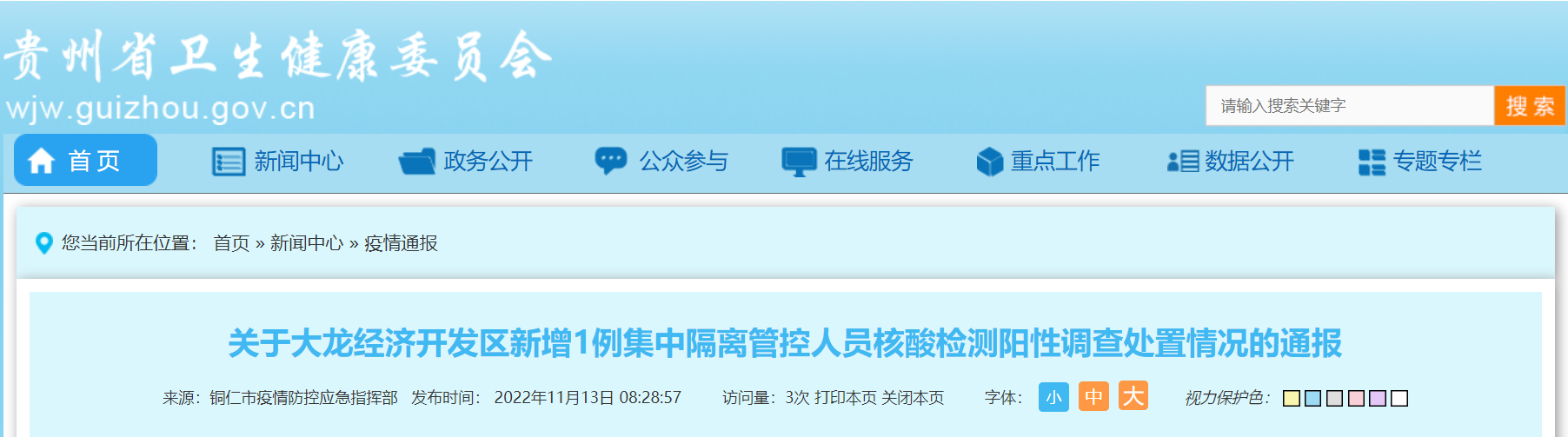 2022年11月12日,贵州大龙经济开发区大龙街道集中隔离点新增1例核酸检测结果异常人员。接到报告后,党委政府高度重视,第一时间作出部署,果断采取处置措施。目前,流调溯源、核酸筛查、隔离观察、环境消杀等应急处置工作正有序开展。