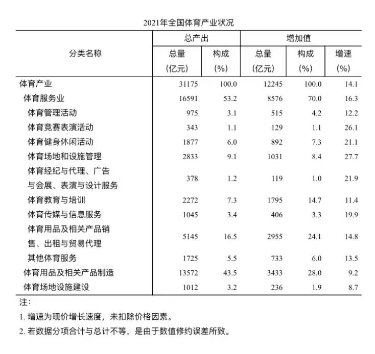 12 月 30 日,国家体育总局和国家统计局发布公告:经核算,2021年全国体育产业总规模(总产出)为31175亿元,增加值为12245亿元。与2020年相比,体育产业总产出增长13.9%(未扣除价格因素,下同),增加值增长14.1%。