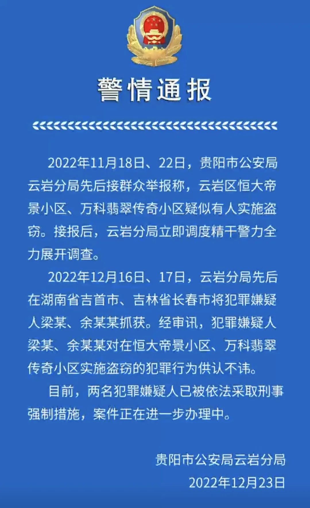 2022年11月18日、22日,云岩公安分局先后接到群众举报。接报后,云岩公安分局立即强化统筹,调度精干警力全力侦破此案。2022年12月16日、17日,云岩公安分局先后在湖南省吉首市、吉林省长春市将犯罪嫌疑人梁某、余某某抓获。