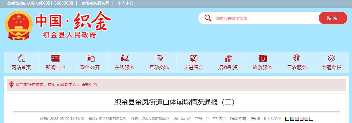 2022年5月9日上午7时许,发现织金县金凤街道山体崩塌1名失联人员,属3名失联人员之一,经医疗队伍检查已无生命体征。