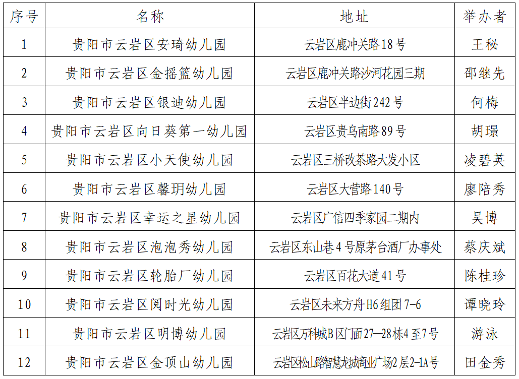 根据《中华人民共和国民办教育促进法》《中华人民共和国民办教育促进法实施条例》等有关法律规定,贵阳市云岩区安琦幼儿园等12所幼儿园向云岩区教育局递交了暂停办学申请,各项资料经审核通过。经研究决定,同意贵阳市云岩区安琦幼儿园等12所幼儿园暂停办学,具体情况如下: