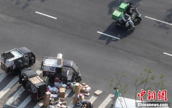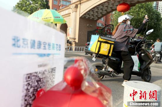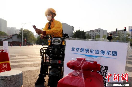 外卖员扫码进入小区。(中新社记者 张宇 摄)