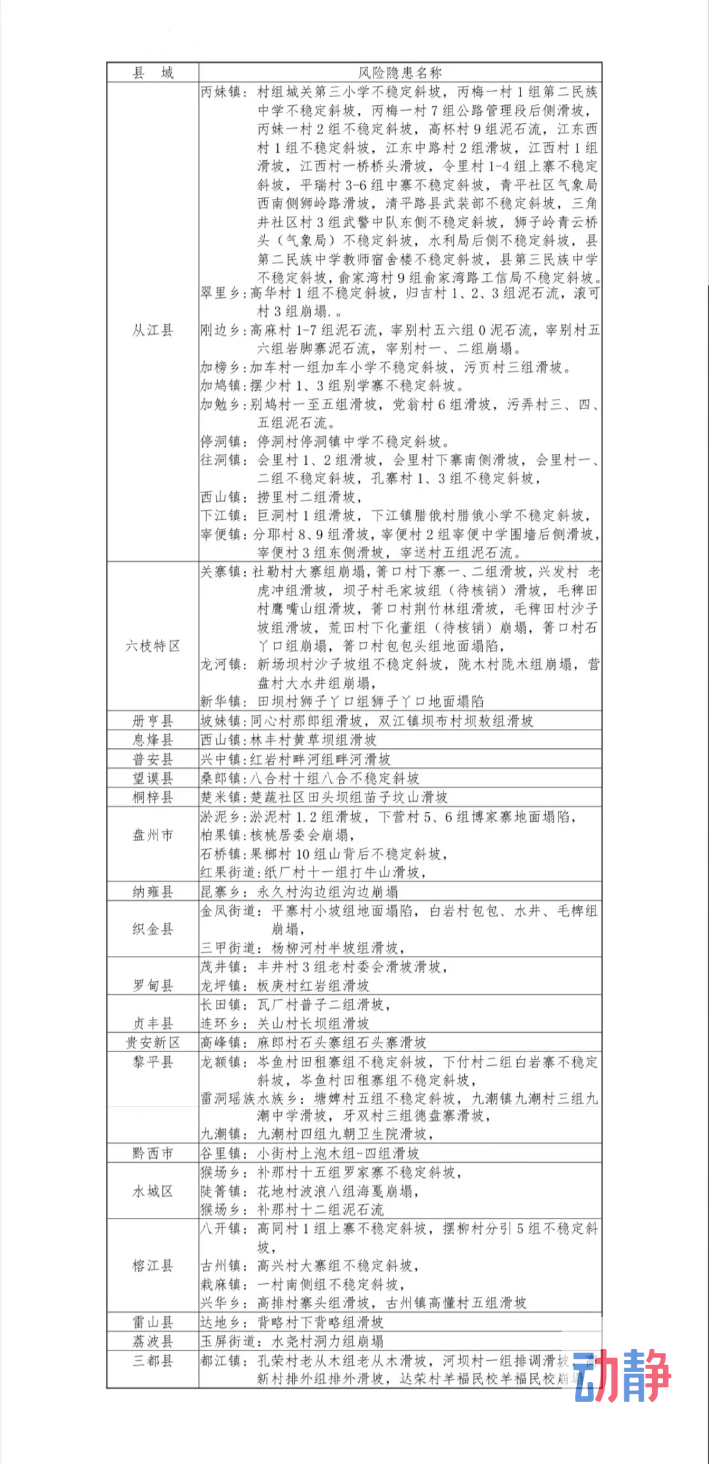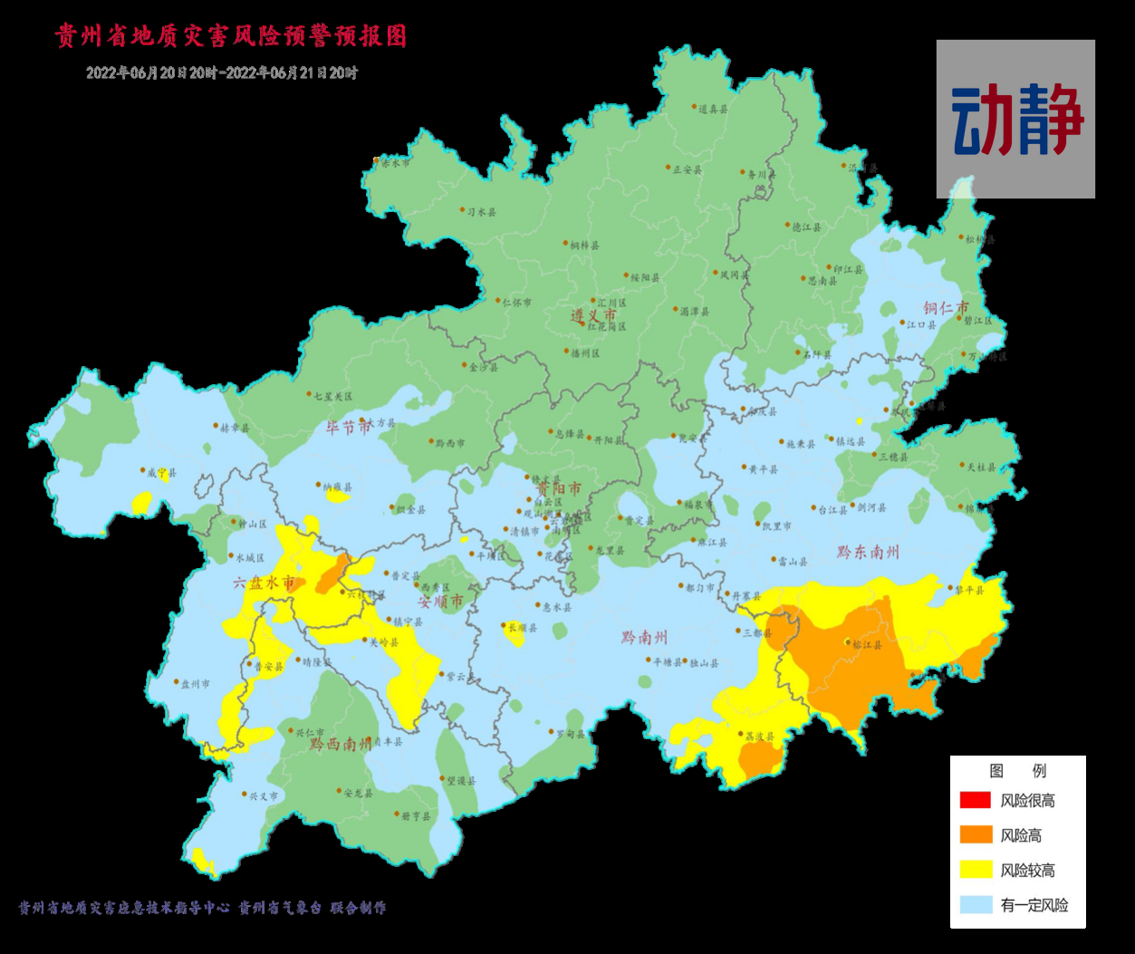 记者从省自然资源厅获悉,综合我省地质灾害易发分区、气象数据、地质灾害防治指挥平台实时监测预警等信息,采用统计回归模型综合研判,未来24小时,从今天(6月20日)下午4点到明天(6月21日)下午4点,地质灾害橙色预警区域有榕江县,从江县大部,水城区,六枝特区,荔波县,三都县,丹寨县,雷山县以及黎平县局部。据了解,这些县区其他部分区域也同样呈现黄色预警。除此之外,黄色预警区域还有镇宁县,盘州市,关岭县,紫云县,普定县,纳雍县,威宁县,长顺县,独山县,镇远县,普安县,晴隆县,兴仁市,兴义市局部。