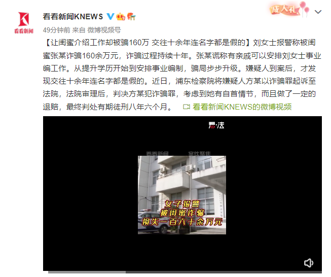 刘女士报警称被闺蜜张某诈骗160余万元,诈骗过程持续十年。张某谎称有亲戚可以安排刘女士事业编工作。从提升学历开始到安排事业编制,骗局步步升级。嫌疑人到案后,才发现交往十余年连名字都是假的。近日,上海浦东检察院将嫌疑人方某以诈骗罪起诉至法院,法院审理后,判决方某犯诈骗罪,考虑到她有自首情节,而且做了一定的退赔,最终判处有期徒刑八年六个月。