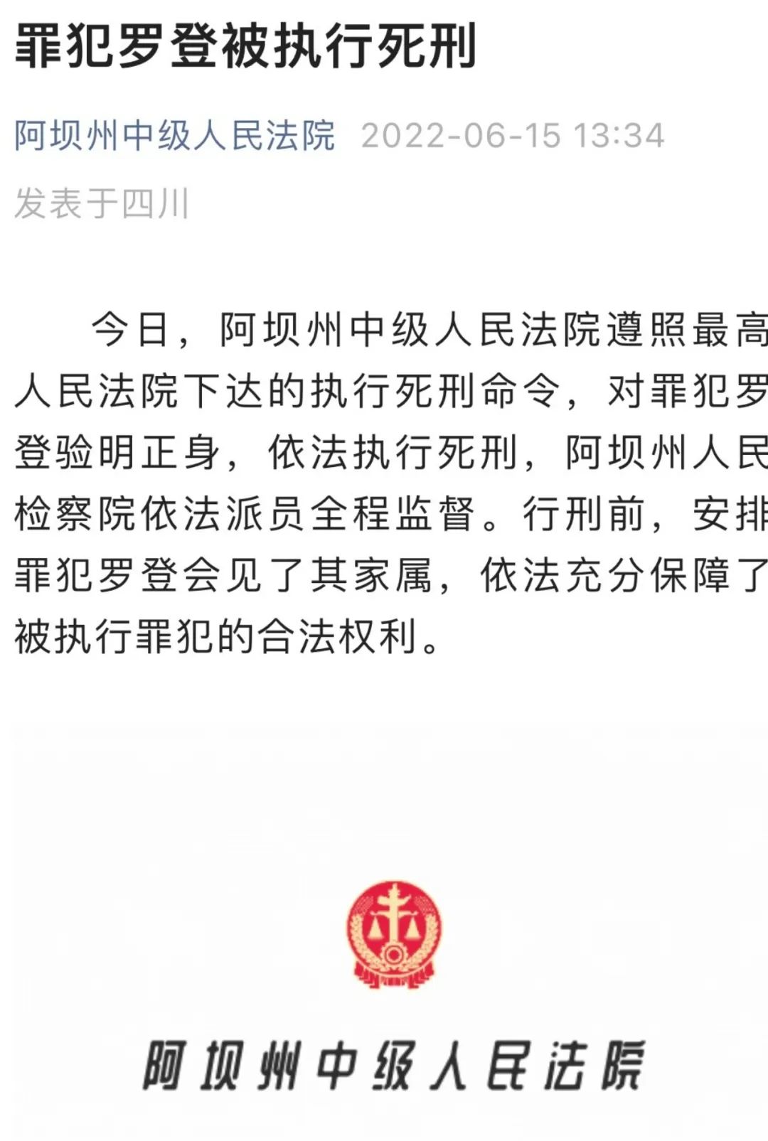 据四川阿坝州中级人民法院消息,6月15日,阿坝州中级人民法院遵照最高人民法院下达的执行死刑命令,对罪犯罗登验明正身,依法执行死刑,阿坝州人民检察院依法派员全程监督。行刑前,安排罪犯罗登会见了其家属,依法充分保障了被执行罪犯的合法权利。