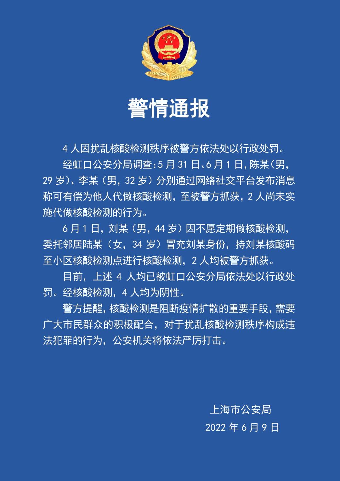 目前,上述4人均已被虹口公安分局依法处以行政处罚。经核酸检测,4人均为阴性。