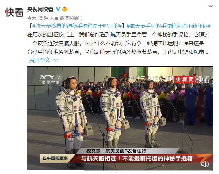 在历次的出征仪式上,我们总能看到航天员手里拿着一个神秘的手提箱,它通过一个软管连接着航天服,它为什么不能随其它行李一起提前托运呢?原来这是一台小型的便携通风装置,又称是航天服的通风热调节装置,里边是电源和风扇。由于航天服是特殊材料,不透气也不透湿,当行走或者是坐车转场的时候,需要通过这个手提箱来降温除湿,实现航天服的内通风。