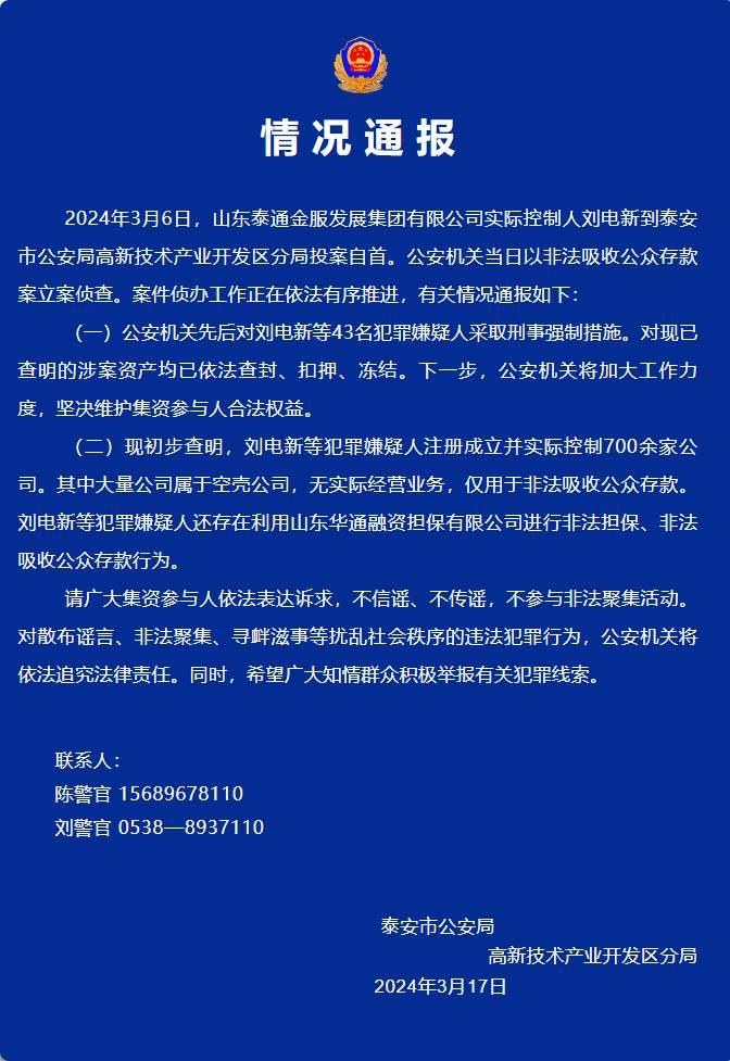 2024年3月6日,山东泰通金服发展集团有限公司实际控制人刘电新到泰安市公安局高新技术产业开发区分局投案自首。公安机关当日以非法吸收公众存款案立案侦查。案件侦办工作正在依法有序推进,有关情况通报如下:
