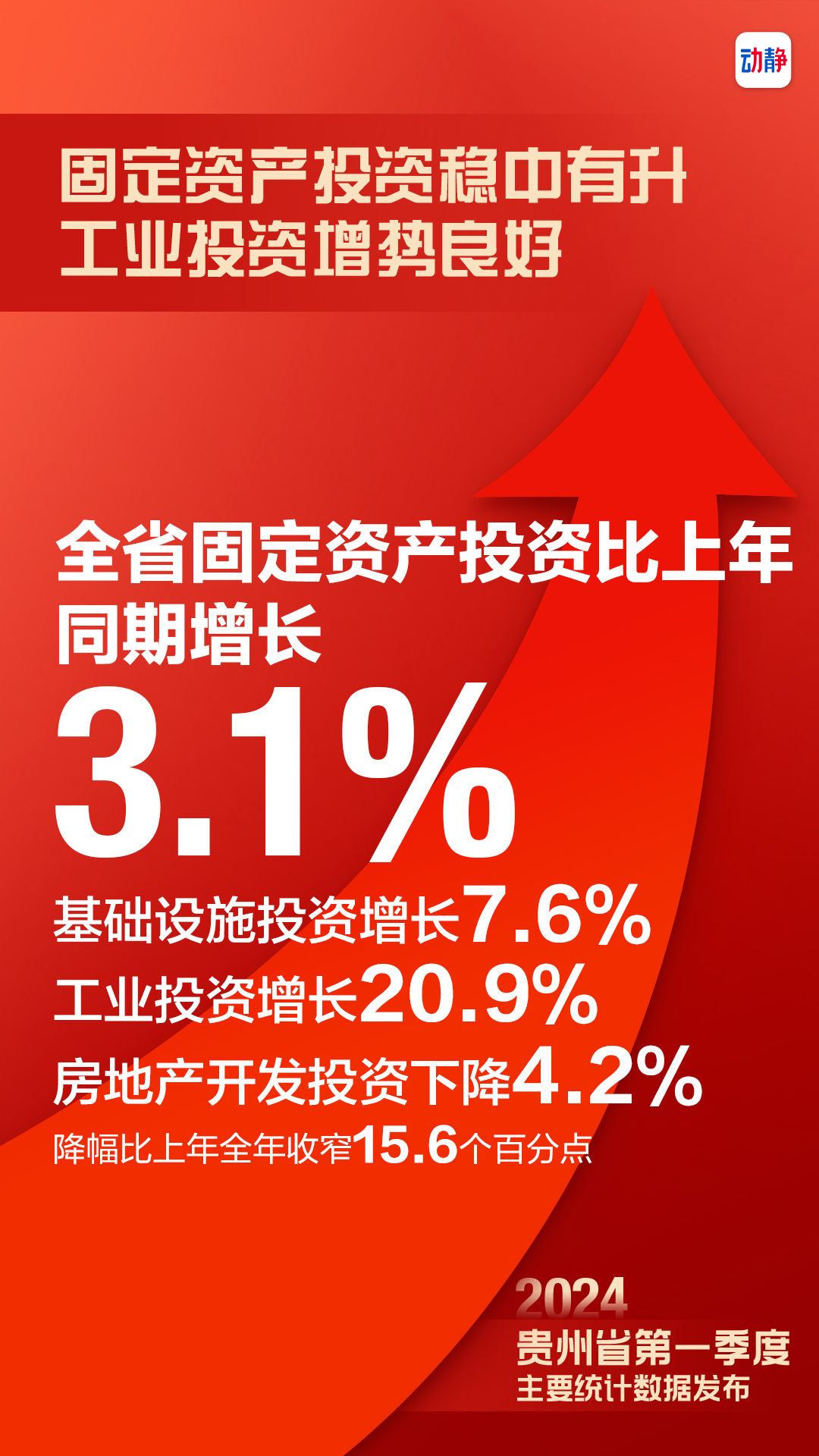 动静记者从新闻发布会上了解到,今年一季度,贵州固定资产投资稳中有升,工业投资增势良好。一季度全省固定资产投资比上年同期增长3.1%。