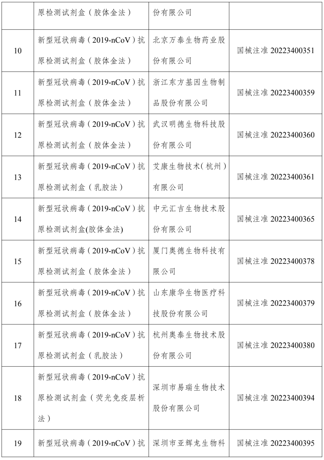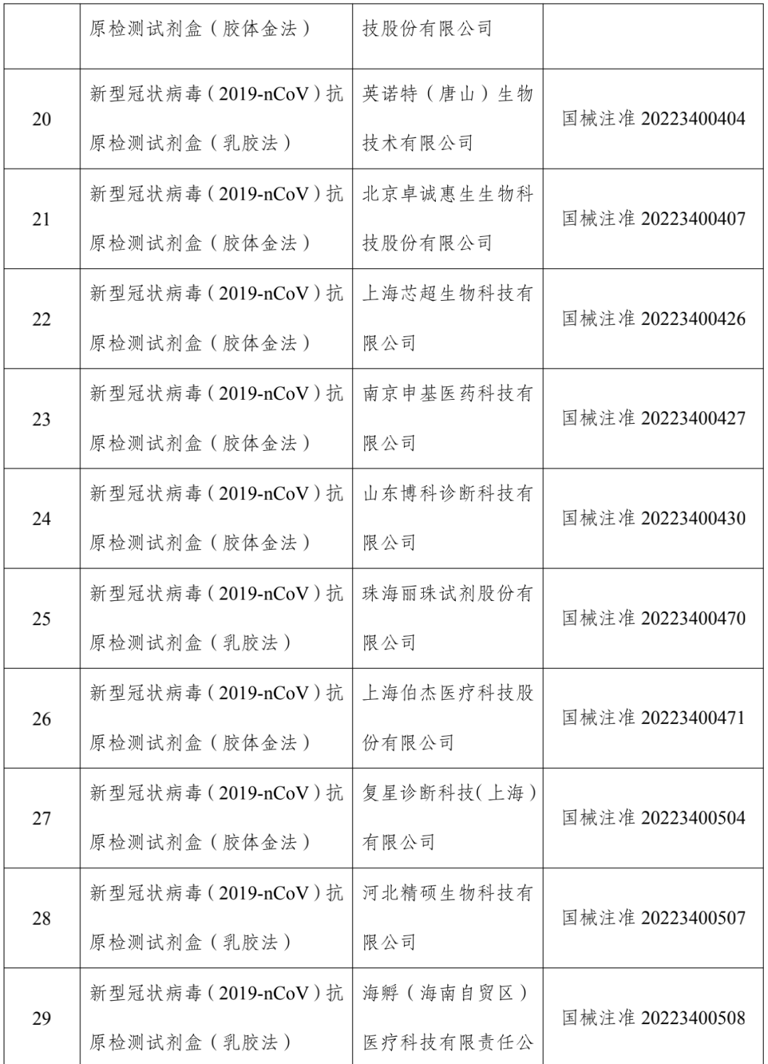 4月20日,国家药监局再次审查批准2个新冠病毒抗原检测试剂产品。截至4月20日,国家药监局已批准29个新冠病毒抗原检测试剂产品。
