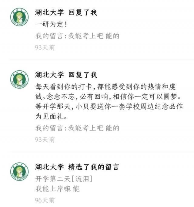 一次,她在学校官微评论区留言:“我能考上吧?能!”,令她惊喜的是,学校也贴心地回复了一个“能”字。随后,她坚持打卡近100天......