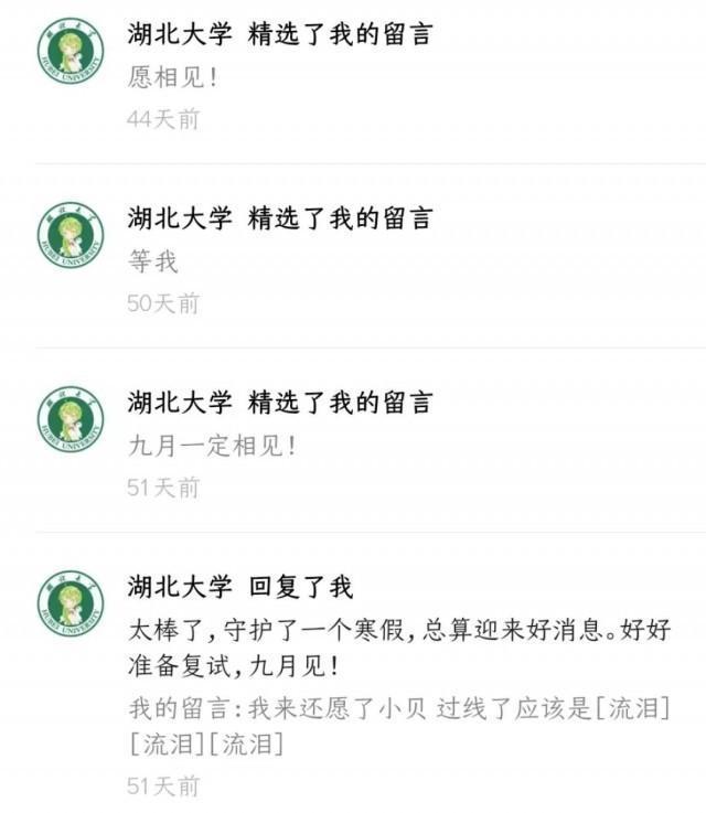 初试成绩出来前一天,学校官微回复“明天就要出分了,相信你一定可以在这还愿喔”;初试结果公布后,学校又回“太棒了!守护了一个寒假,总算迎来了喜讯!准备复试,九月见!”