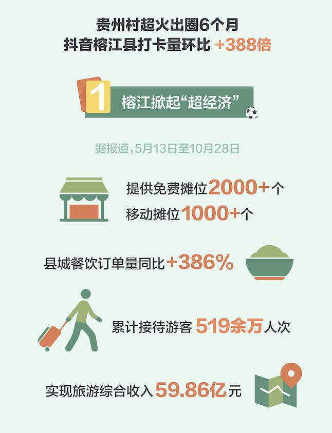 随着“村超”的火热,当地“超经济”也被点燃。榕江县在抖音生活服务平台的订单同比增长3.4倍,酒旅订单同比增长超160倍。榕江县在抖音生活服务平台的餐饮、休闲娱乐订单均同比增超3倍。