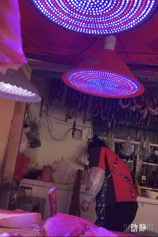 泛着特殊色温的生鲜灯,曾被广泛应用于各大商场超市。生肉经过生鲜灯照射,被提色增亮,同时也遮掩了缺陷和瑕疵。