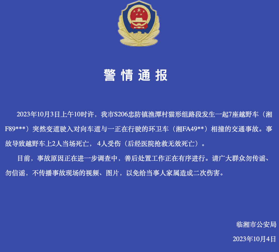 2023年10月3日上午10时许,我市S206忠防镇渔潭村猫形组路段发生一起7座越野车(湘F89***)突然变道驶入对向车道与一正在行驶的环卫车(湘FA49**)相撞的交通事故。事故导致越野车上2人当场死亡, 4人受伤(后经医院抢救无效死亡)。