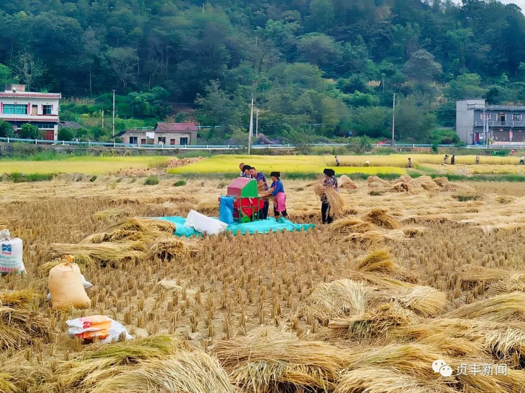 秋收时节,龙场镇三河村180余亩高标准农田水稻迎来丰收,秋风拂过,稻香扑鼻,沉甸甸的稻穗随风摇曳,掀起层层金色稻浪。伴随着阵阵收割机轰鸣声,成熟饱满的稻穗被收割进机仓,农户忙碌装运稻谷,田间地头一片繁忙景象。