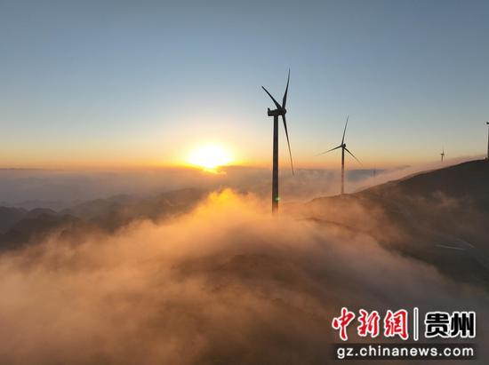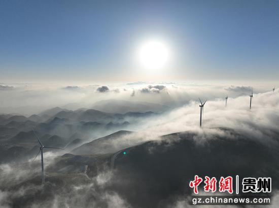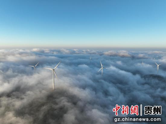 11月27日清晨,威宁彝族回族苗族自治县百草坪出现云海景观,风力发电机矗立在在云海之中,宛若仙境。