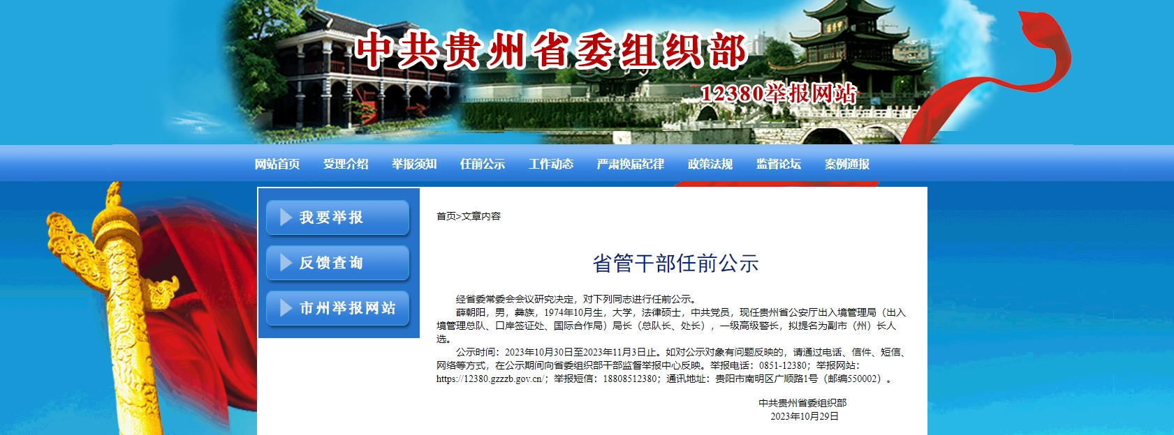 公示时间:2023年10月30日至2023年11月3日止。如对公示对象有问题反映的,请通过电话、信件、短信、网络等方式,在公示期间向省委组织部干部监督举报中心反映。举报电话:0851-12380;举报网站:https://12380.gzzzb.gov.cn/;举报短信:18808512380;通讯地址:贵阳市南明区广顺路1号(邮编550002)。