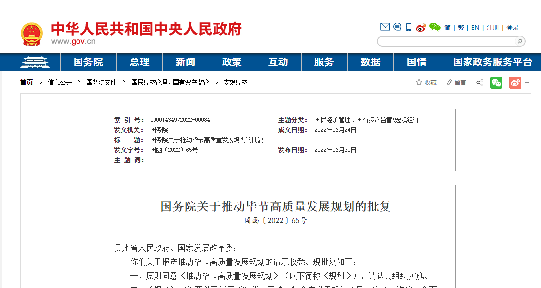 国务院关于推动毕节高质量发展规划的批复