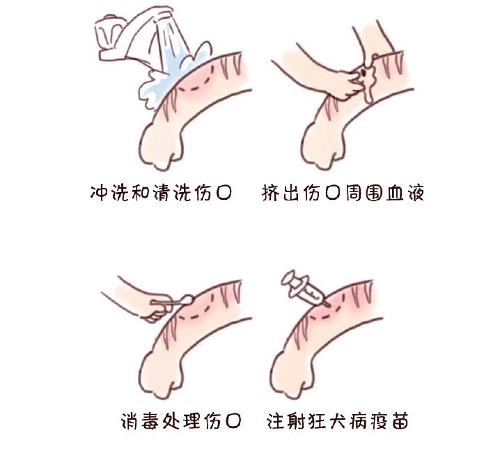 冲洗和清洗伤口→挤出伤口周围血液→消毒处理伤口→注射狂犬病疫苗