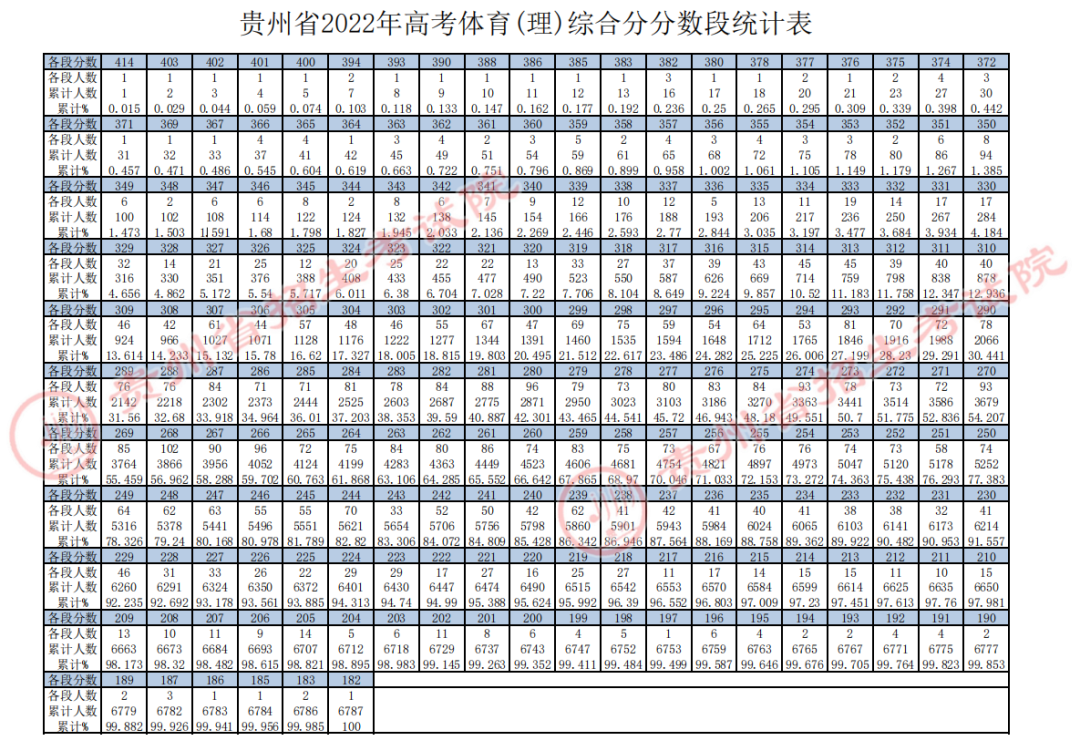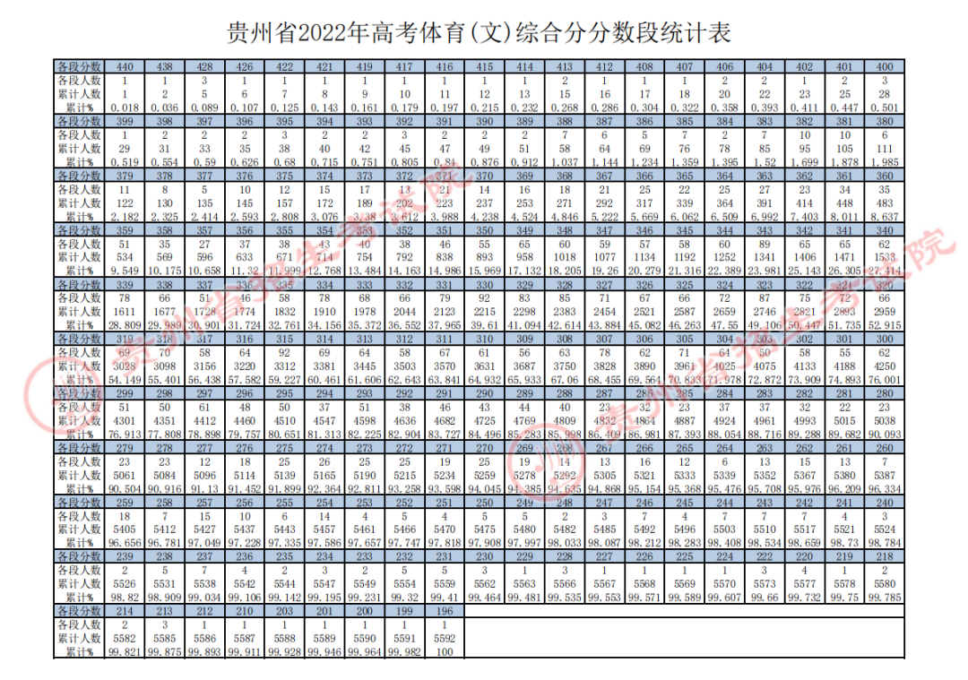 贵州省2022年高考体育综合分、艺术类统考文化上线专业考试分数段统计表已公布,如下: